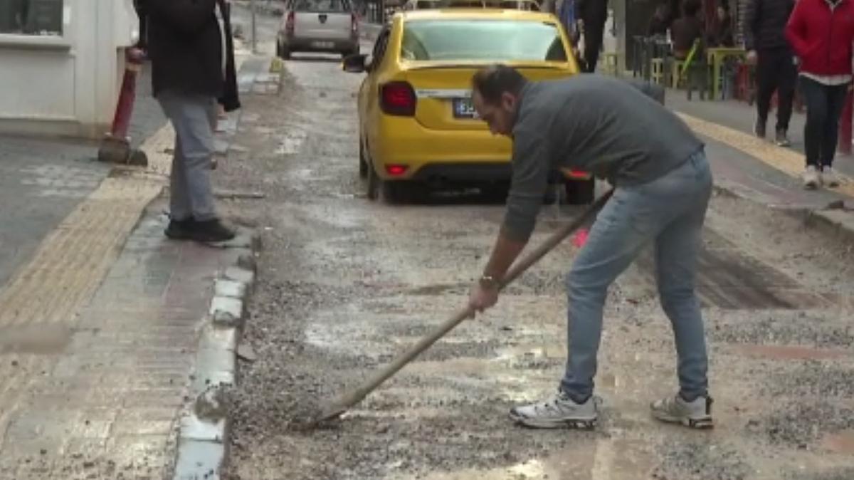 Bazı esnaflar ise kendi imkanlarıyla su biriken çukurları doldurmaya çalıştı.