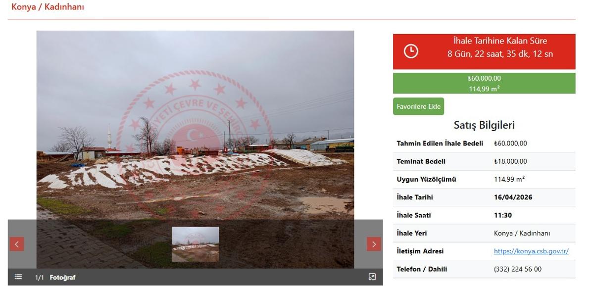 Milli Emlak Genel Müdürlüğü, Konya Kadıhanı’nda tahmin edilen ihale bedeli 60.000 TL’den arsa satılacağını açıkladı. Bu taşınmazın teminat bedeli 18.000 TL olarak belirtildi. Uygun yüzölçümü 114,99 metrekare olarak duyurulan tarlanın ihale zamanı 16 Nisan 2026 saat 11.30.