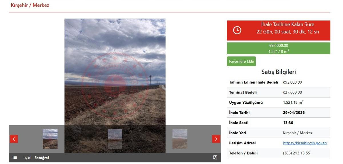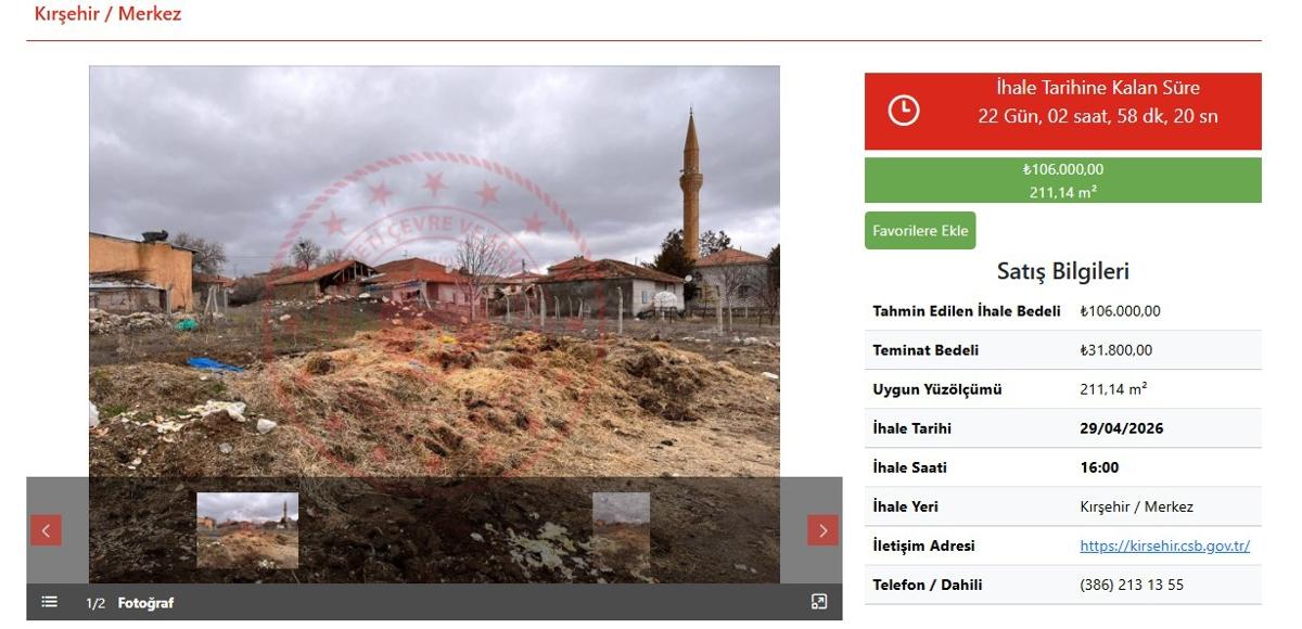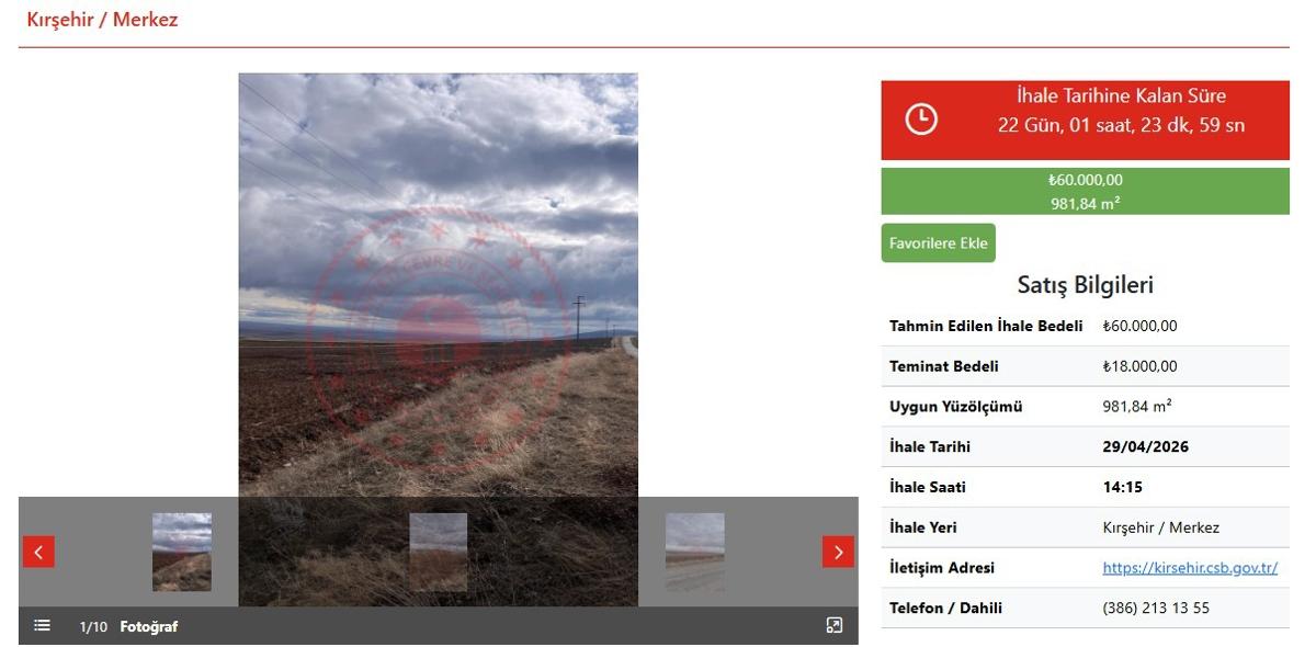 Milli Emlak Genel Müdürlüğü, Kırşehir Merkez’de tahmin edilen ihale bedeli 60.000 TL’den tarla satılacağını duyurdu. Bu taşınmazın teminat bedeli 18.000 TL olarak açıklandı. Uygun yüzölçümü ise 981,84 metrekare. İhale zamanı 29 Nisan 2026 saat 14.15.
